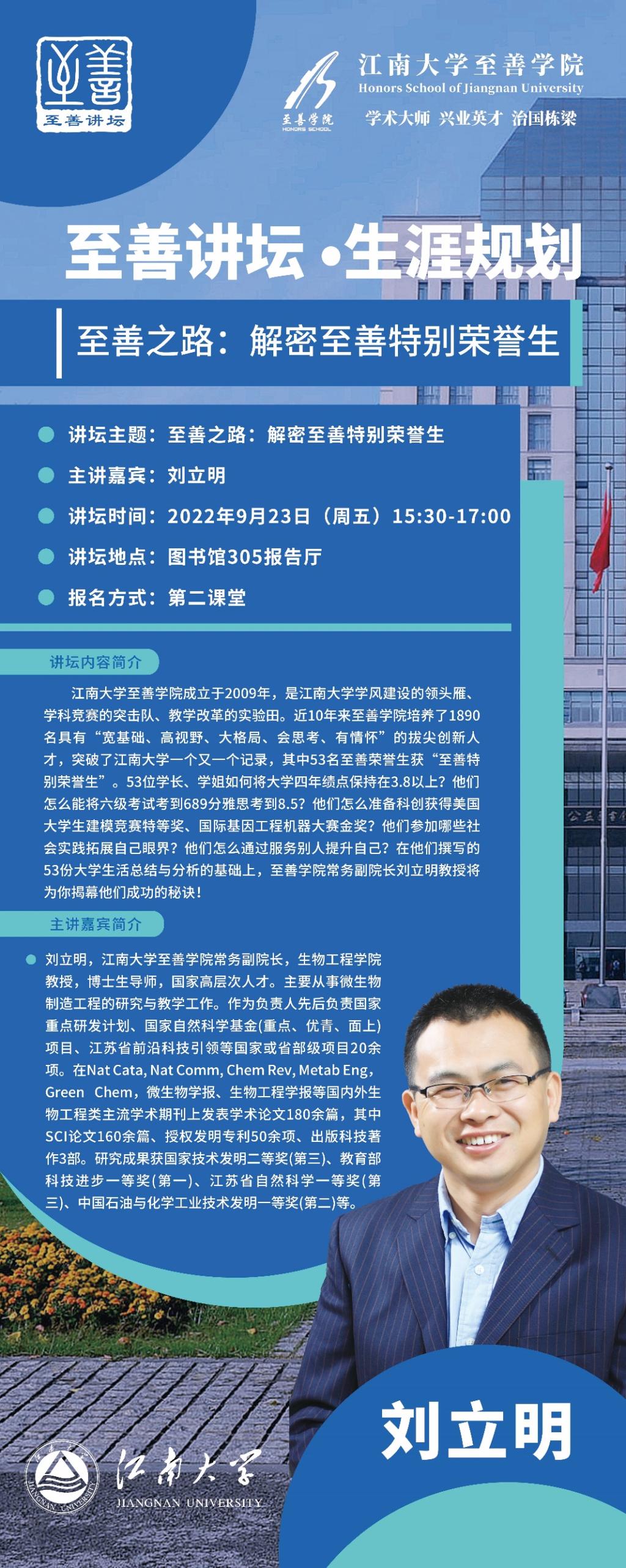 江南大学至善学院成立于2009年,是江南大学学风建设的领头雁、学科竞赛的突击队、教学改革的实验田。近10年来至善学院培养了1890名具有宽基础、高视野、大格局、会思考、有情怀的拔尖创新人才,突破了江南大学一个又一个记录,其中53名至善荣誉生获至善特别荣誉生53位学长、学姐如何将大学四年绩点保持在3.8以上?他们怎么能将六级考试考到689分雅思考到8.5?他们怎么准备科创获得美国大学生建模竞赛特等奖、国际基因工程机器大赛金奖?他们参加哪些社会实践拓展自己眼界?他们怎么通过服务别人提升自己?在他们撰写的53份大学生活总结与分析的基础上,至善学院常务副院长刘立明教授将为你揭幕他们成功的秘诀!