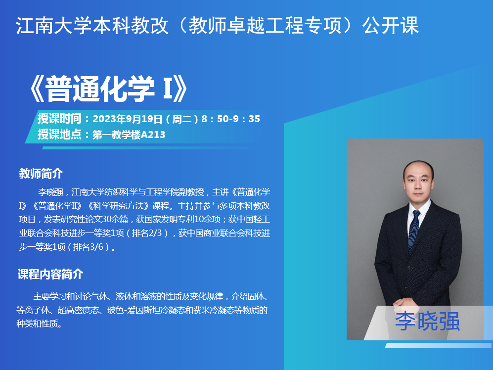 李晓强,江南大学纺织科学与工程学院副教授,主讲《普通化学I》《普通化学II》《betway必威官方网站app方法》课程。主持并参与多项本科教改项目,发表研究性论文30余篇,获国家发明专利10余项;获中国轻工业联合会科技进步一等奖1项(排名2/3),获中国商业联合会科技进步一等奖1项(排名3/6)。