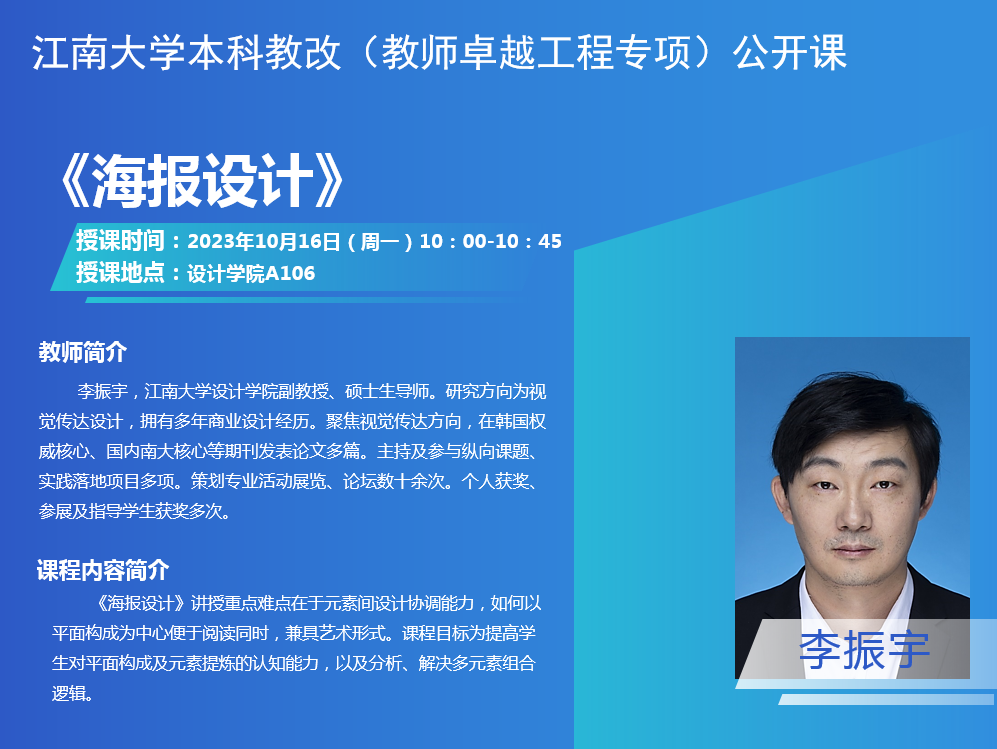 《海报设计》讲授重点难点在于元素间设计协调能力,如何以平面构成为中心便于阅读同时,兼具艺术形式。课程目标为提高学生对平面构成及元素提炼的认知能力,以及分析、解决多元素组合逻辑能力。