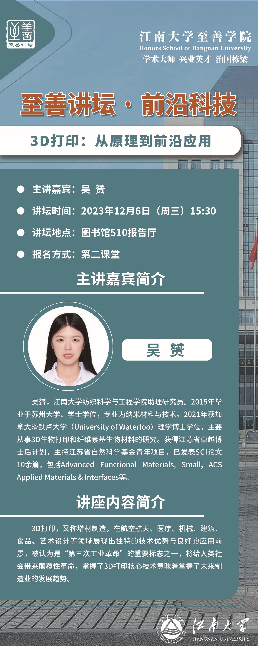 吴赟,江南大学纺织科学与工程学院助理研究员。2015年毕业于苏州大学、学士学位,专业为纳米材料与技术。2021年获加拿大滑铁卢大学(University of Waterloo)理学博士学位,主要从事3D生物打印和纤维素基生物材料的研究。获得江苏省卓越博士后计划,主持江苏省自然科学基金青年项目,已发表SCI论文10余篇,包括Advanced Functional Materials, Small, ACS Applied Materials & Interfaces等。