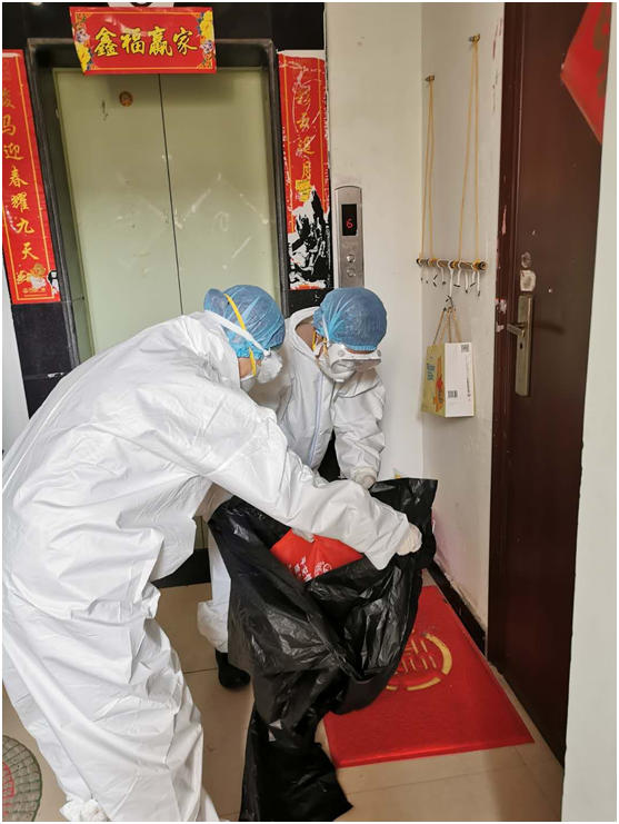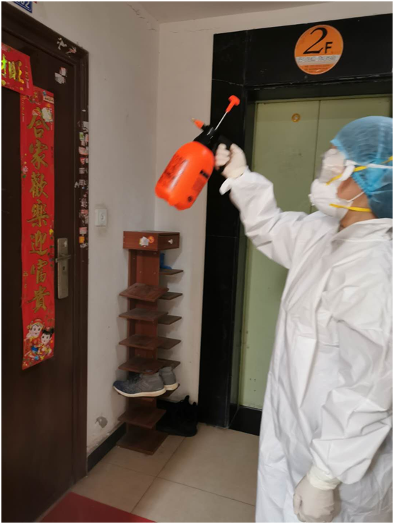 那时候疫情紧张,我们一线防疫人员人手缺乏,物资也缺乏,手套、口罩、防护服刚开始都没法保障,被隔离户越来越多。隔离人员情绪不好,有抵触现象,在那种情况下我也焦虑了,但是一想到自己肩负的责任,我只能压制控制自己,耐心地开导他们,了解他们的想法和困难,积极协调相关人员帮助解决他们的问题,增强他们的信赖感。每天,都必须去给隔离人员一天两次测体温、送食物、收拾生活垃圾和做好消杀工作,24小时随时跟踪他们的身体状况,有发烧的及时转运至定点医院。小区内房屋大多数是多层结构,意味着运送物资都是扛着爬楼梯,即使有电梯的也不敢去坐,因为有些居民认为我们一直工作于不安全的环境,所以为了打消他们的顾虑我们宁可爬楼梯。累了随地坐下来休息,渴了都不敢喝水,即使穿了很少的衣服防护服里也总是湿透,汗水在额头不知不觉流下来,雾气模糊了护目镜,无论刮风下雨,毫无怨言,我坚信坚持就是胜利。