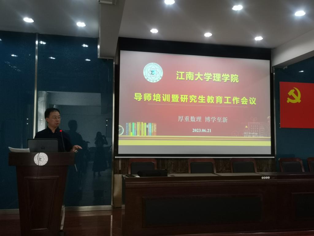 为贯彻落实《江南大学研究生导师管理办法》,进一步推进高素质研究生导师队伍建设,6月21日下午,理学院在202会议室开展研究生导师培训暨理学院研究生教育工作会议。学院全体导师参加了此次会议,会议由副院长席曦主持。