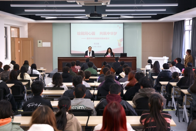 12月8日下午,校党委书记吴正国以《绘就同心圆 共筑中华梦——铸牢中华民族共同体意识》为题,在理学院钱伟长楼215报告厅为少数民族学生讲授了一堂生动的思政课。党委办公室、党委统战部、理学院、法学院相关领导老师,理学院少数民族预科班学生、法学院少数民族学生代表等聆听了讲座。活动由理学院党委书记王珏主持。