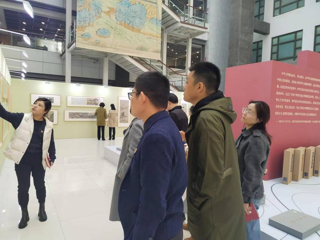 在“文化传承守初心”第二部分,社会科学处党支部书记杨恋恋通过播放《以习近平文化思想为指引 谱写中华民族现代文明新华章》《习近平文化情节》微视频,带领与会人员深入学习领会习近平文化思想,并就这一思想的有关重要论述,进行简要梳理和解读。为了加强理论联系实际,把握“第二个结合”重大意义,提升对推动中华优秀传统文化创造性转化、创新性发展的认知,双方参会人员共同参观了“盛世修典——‘中国历代绘画大系’成果展”。由浙江大学、浙江省文物局编纂出版的“中国历代绘画大系”,是一项规模浩大、纵贯历史、横跨中外的国家级重大文化工程,该项目共收录海内外263家文博机构的中国绘画藏品12405件。其中国内藏品9155件、国外藏品3250件,涵盖了绝大部分传世的“国宝”级绘画珍品,编纂出版图书共计60卷226册。这是迄今为止同类出版物中精品佳作收录最全、出版规模最大的中国绘画图像文献。