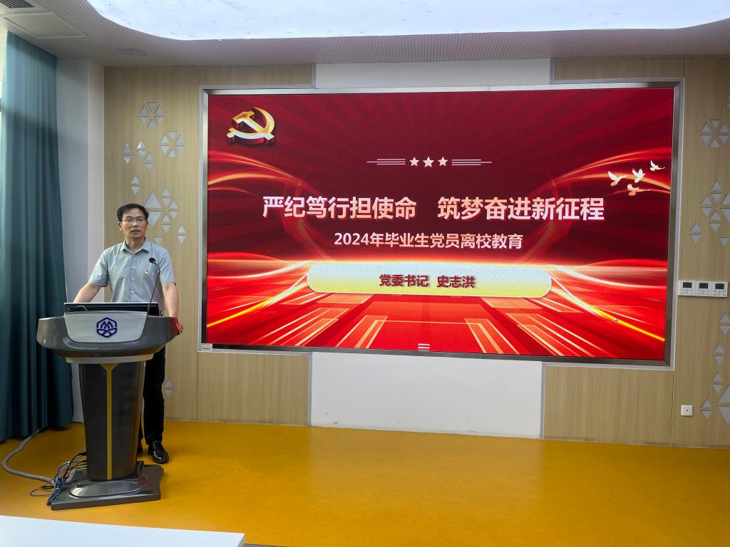 最后,党委书记史志洪以“严纪笃行担使命,筑梦奋进新征程”为主题进行毕业生党员离校教育。他从坚定理想信念,争当政治忠诚的捍卫者;立志坚毅笃行,争当伟大事业的生力军;砥砺奋进未来,争当开拓创新的排头兵等三个方面提出了希望和要求,强调同志们要牢记在学校接受的党纪教育,明晰“边界”,标注“禁区”,以绝对清醒的头脑,扣好走出校门、廉洁从业的“第一粒扣子”,勉励党员同志们加强学习、勤奋工作、奋勇争先,充分发挥党员的先锋模范作用和党的优良传统,保持共产党员先进性,以更加饱满的热情和更加坚定的信念,主动投身经济建设和社会发展主战场,为实现中华民族伟大复兴的中国梦贡献青春力量。