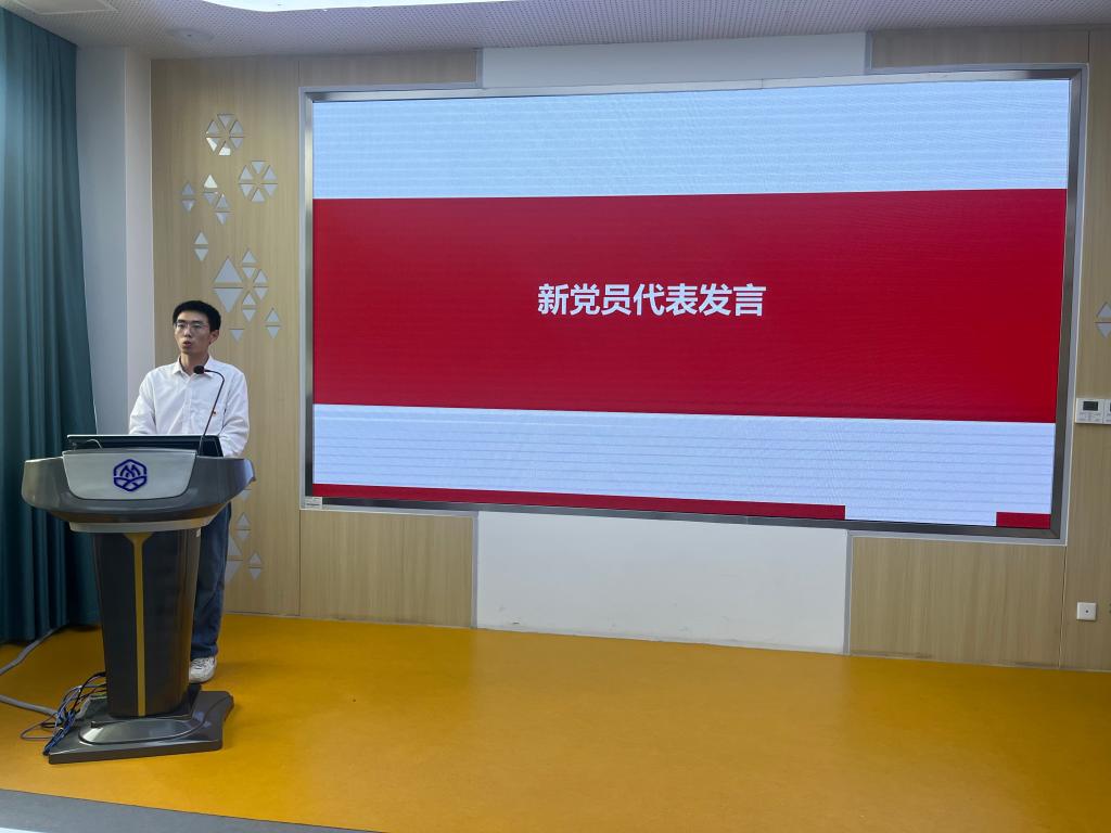 接着,药学2101班刘政同志代表新党员发言。他表示,作为一名新党员,生逢盛世,更要肩负重任,在党的领导和培养下,青年党员将坚持用党的创新思想和科学理论武装头脑、指导成长,做习近平新时代中国特色社会主义思想的坚定信仰者、忠实践行者,不负青春、不负韶华,以实际行动践行党员的职责和使命,努力成为堪当民族复兴大任的时代新人,让青春在为祖国、为民族、为人民的不懈奋斗中绽放绚丽之花。