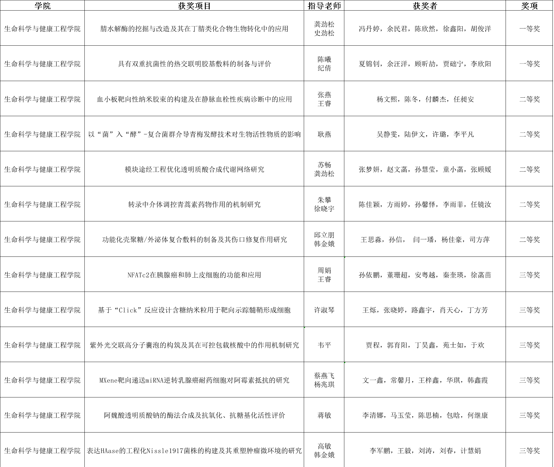 由龚劲松、史劲松老师指导,冯丹婷、余民君、陈欣然、徐鑫阳、胡俊洋同学参赛的项目《腈水解酶的挖掘与改造及其在丁腈类化合物生物转化中的应用》,陈曦、纪倩老师指导,夏锦钊、余汪洋、顾昕劼、贾础宁、李欣阳同学参赛的项目《具有双重抗菌性的热交联明胶基敷料的制备与评价》荣获省赛一等奖。