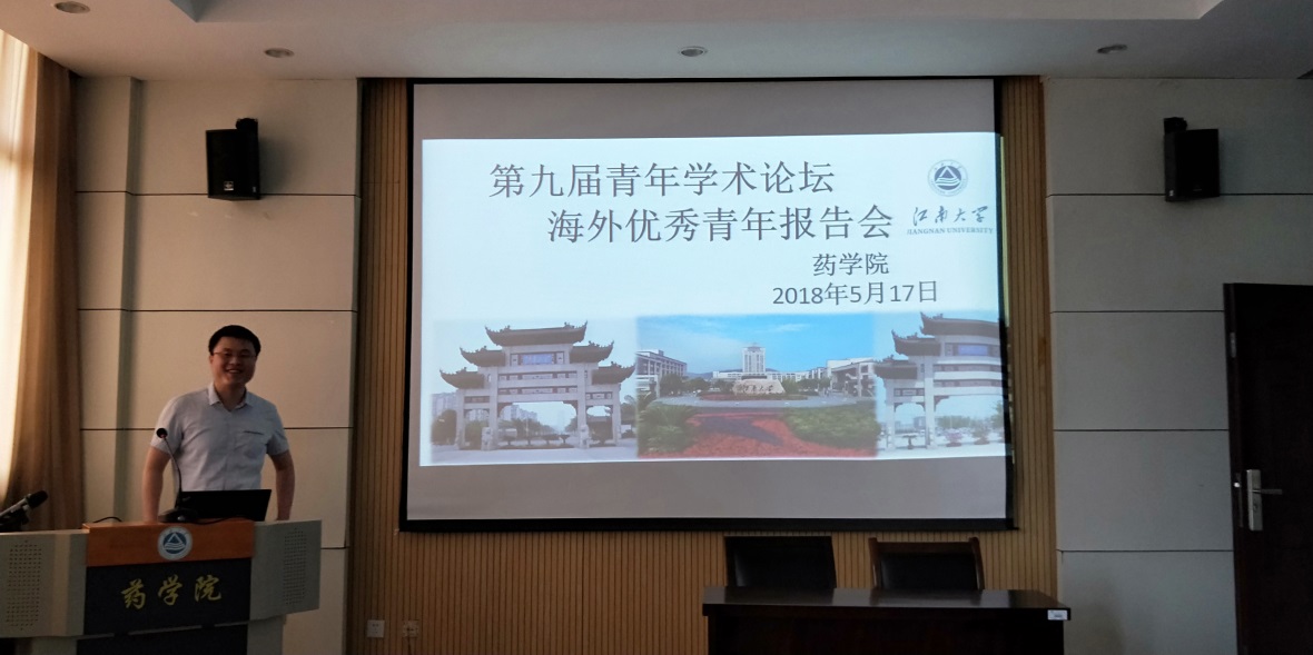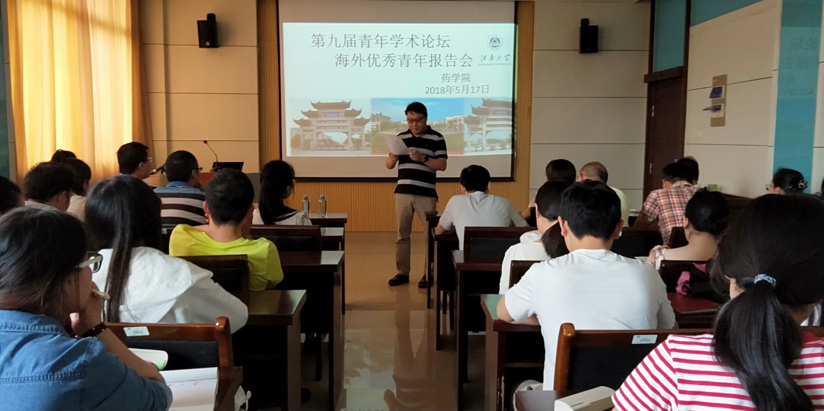 5月17日下午,药学院在306举行了学术论坛报告会,邀请了来自荷兰格罗宁根大学的马超博士作了关于“先进功能生物材料在生物医药领域的研究和应用”的学术报告,会议由药学院院长陈敬华教授主持,还有冯柏年教授、药学系主任王文龙、院长助理巩凯等老师和感兴趣的研究生、本科生共同聆听了报告。