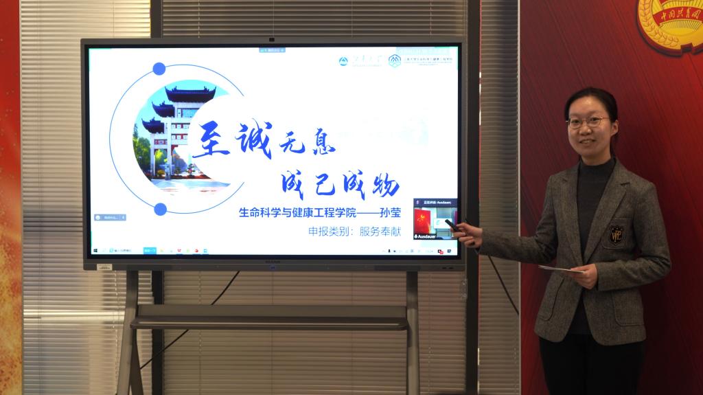 孙莹在担任班级团支书期间,认真落实“三会两制一课”制度,开展特色团日活动,带领团支部获评全省高校“千优活力团支部”、无锡市先进学生集体、江南大学五四红旗团支部等7项集体荣誉。助力朋辈帮扶,她连续三年担任学业辅导员,从学习方法到备考技巧,从项目申报到保研经验,参与6次新老交流,工作考评全院第一,获评校优秀学生学业辅导员。她担任生科院学生会执行主席和本科生党支部书记,投身团学工作,协助学院党委开展党务工作,用心服务同学,获评“优秀共产党员”。作为生科学子,她走进多个志愿服务阵地积极开展药物科普教育,用行动让健康中国理念深入人心,带领“科研报国·讲好制药人的故事”研学实践团获评无锡市大中专学生志愿者暑期文化科技卫生“三下乡”社会实践活动优秀团队。
