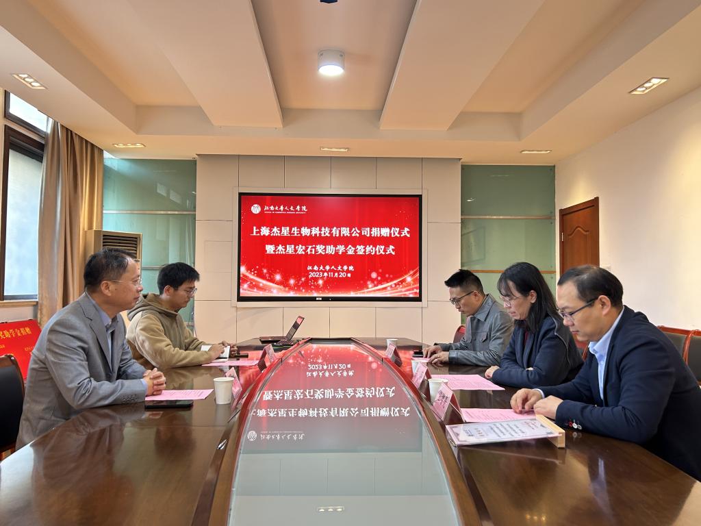 11月20日上午,人文学院“杰星宏石奖助学金”捐赠仪式在田家炳楼207会议室顺利举行。上海杰星生物科技有限公司代表徐宏伟,校社会合作与校友联络处副处长任增亮,人文学院党委副书记、副院长李萍,分团委书记邓昌海,辅导员王振彬共同参与。捐赠仪式由邓昌海主持。